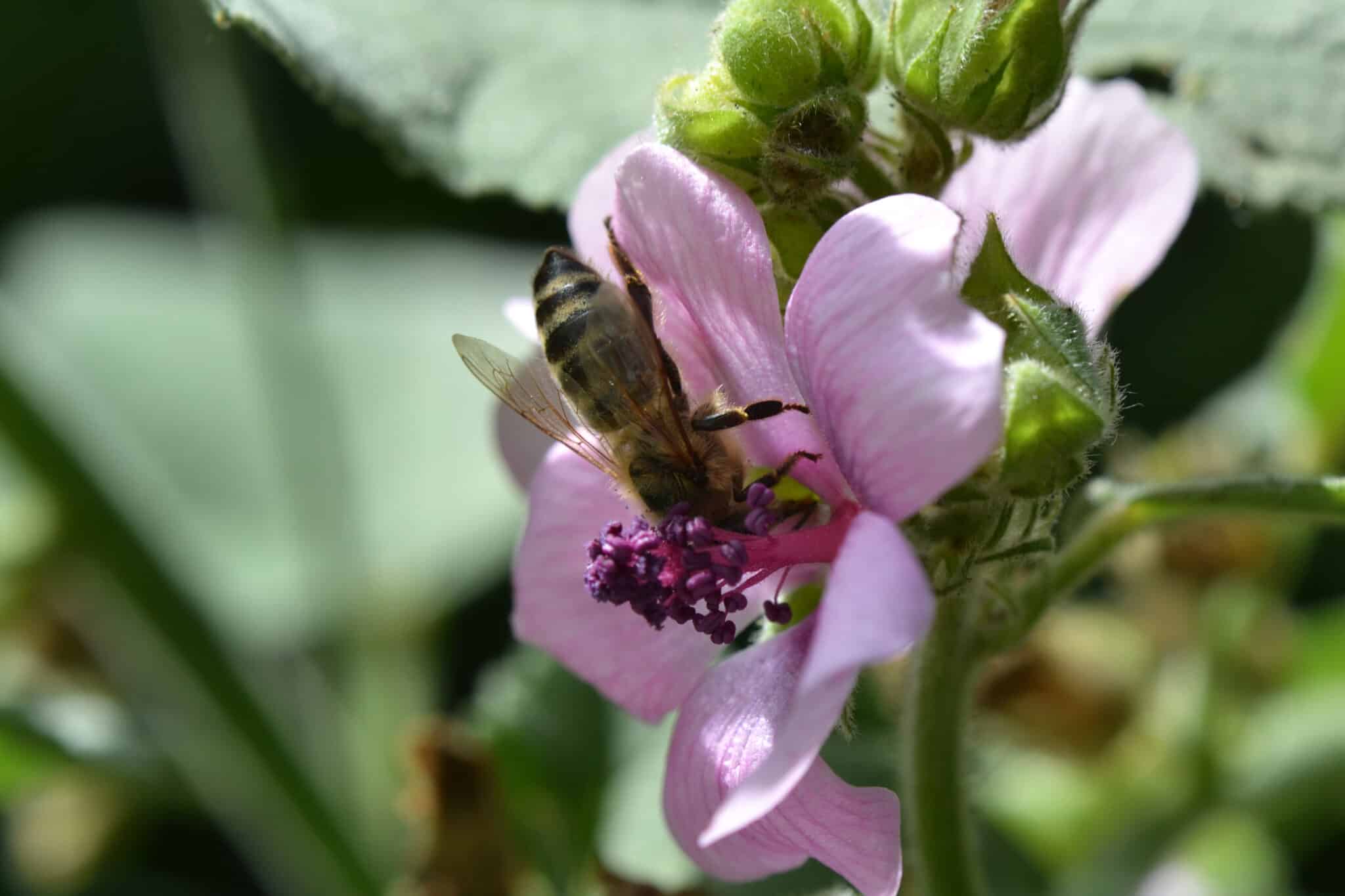 Der nächste im Bunde ist der Echte Eibisch. Er ist ein Spätzünder; immer wieder erreichen uns Anfragen, ob er nicht über den Winter gestorben sei. Tatsächlich treibt er einfach spät aus, blüht dann auch spät, frühestens ab August. Das freut Bienchen und Co, die ja auch im Herbst noch gerne speisen möchten.