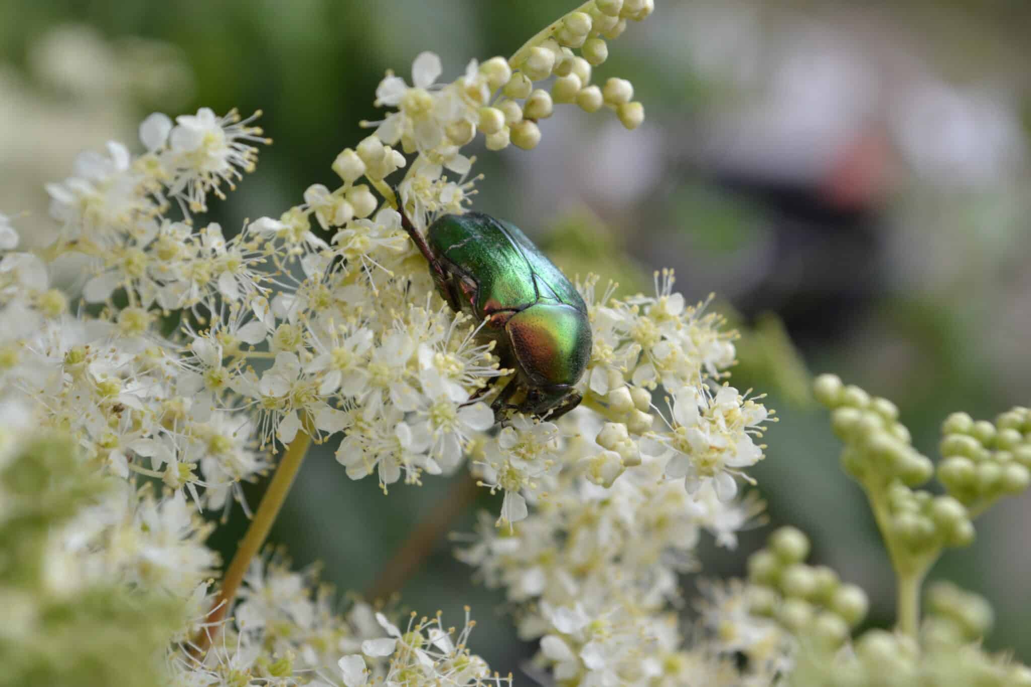 Und last, but not least, das echte Mädesüß (Filipendula ulmaria). Dazu später mal mehr, ich finde, es hat einen eigenen Blog verdient. Hier nur 2 Fotos, eines am Rand der Sickermulde, eines mit einem der Nutznießer der duftenden Blüten, dem Rosenkäfer.