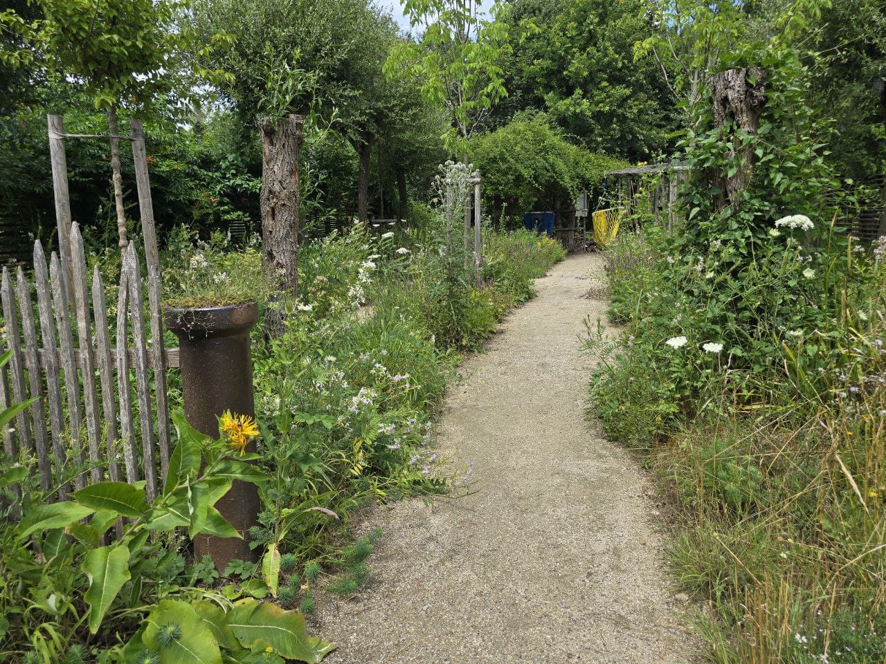 Hier sieht man den Eingang, der Weg ist als versickerungsoffene wassergebundene Decke ausgeführt, er führt zwischen den Beeten nach hinten zu zwei Schaukelsesseln. Entspannung pur.